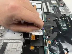 Используйте пластиковую лопатку, чтобы отщёлкнуть ленточный кабель, идущий от верхней средней части аккумулятора к материнской плате, из разъёма на плате.