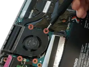 Используя крестовую отвёртку Phillips #0, открутите четыре винта длиной 4 мм, расположенные непосредственно рядом с вентилятором.