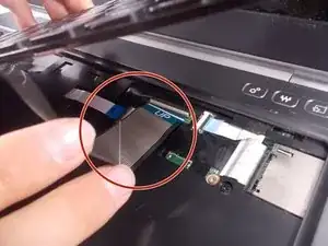 Вам нужно будет поднять небольшой зажим, где этот тонкий провод входит в соединение, чтобы провод мог быть освобожден, и клавиатура могла быть снята.