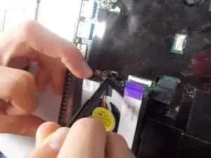 После удаления винта используйте пинцет, чтобы потянуть за зажим, как показано. Поднимите зажим, чтобы создать зазор между вентилятором и остальной частью ноутбука.