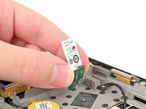 Используйте плоский конец лопатки, чтобы поднять разъём кабеля трекпада строго вверх и вынуть его из гнезда на плате считывателя NFC.