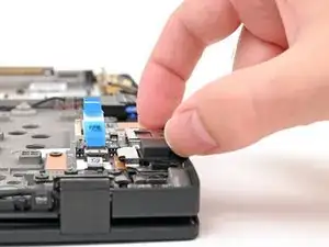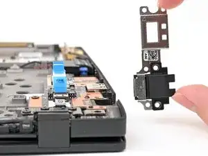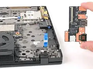 Возьмите плату ввода‑вывода за кромки и потяните её прямо вверх, чтобы извлечь из ноутбука.