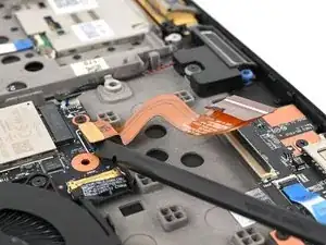 Вставьте плоский конец лопатки под короткий край пресс‑разъёма межсоединительного кабеля на материнской плате и подденьте вверх, чтобы отсоединить его.