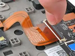 Используйте чистый ноготь или плоский конец лопатки, чтобы откинуть фиксирующую защёлку на ZIF‑разъёме межсоединительного кабеля, расположенном на плате ввода/вывода.