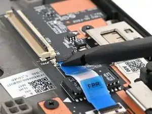 Используйте ноготь или плоский конец лопатки, чтобы откинуть фиксирующую защёлку на ZIF‑разъёме кабеля считывателя отпечатков, расположенном на плате ввода/вывода.