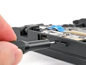 Захватите пластиковый язычок кабеля пинцетом или пальцами и вытяните кабель из гнезда.