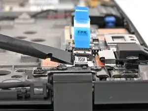 Просуньте плоский конец лопатки под печатную плату на кабеле считывателя отпечатков и подденьте, чтобы отделить клей, который её фиксирует.
