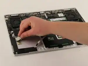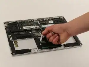 Используйте лопаточку, чтобы отсоединить штекер ленточного кабеля от трекпада.