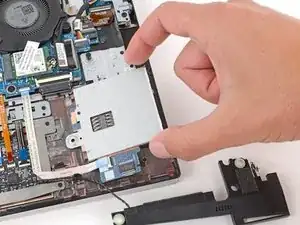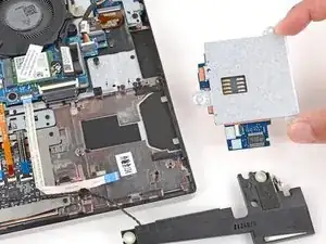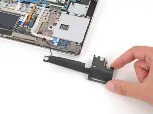 Осторожно приподнимите динамик с правой стороны (тот, что закрывает считыватель смарт-карт) прямо вверх и снимите его с штырей.