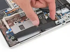 Используйте острый конец лопатки или ноготь, чтобы поочередно нажимать с обеих сторон на направляющий разъем батареи и полностью вывести его из гнезда.
