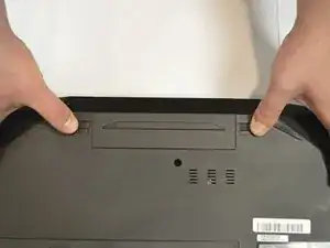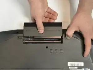 Одной рукой удерживайте нефиксирующую защёлку в отведённом положении, а другой рукой потяните батарею вдали от компьютера.