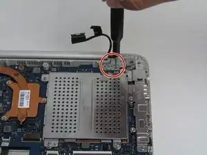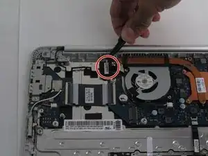 Используйте лопатку, чтобы отсоединить кабель батареи от ноутбука и удалить батарею.