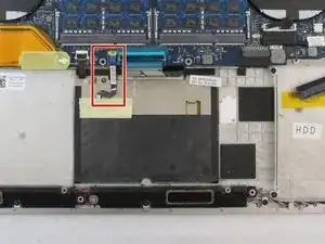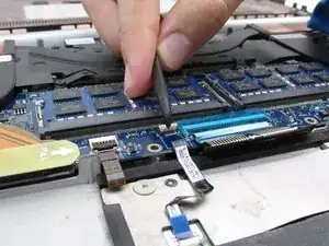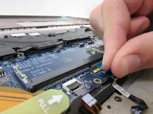 Уберите провод, который соединяет сенсорную панель с материнской платой, используя крючковый инструмент и потяните за язычок, чтобы безопасно удалить провод.