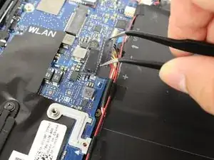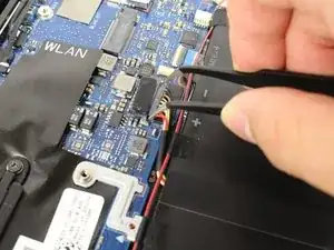 Оттяните разъем кабеля батареи в сторону батареи, чтобы отключить его от разъема на плате.