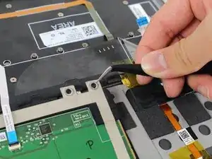 Отклейте скотч, фиксирующий кабели динамиков к батарее.