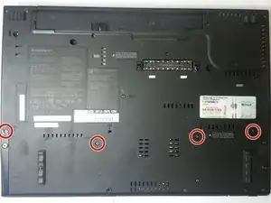 Переверните компьютер и открутите четыре указанные винта с помощью отвертки Phillips #1.