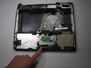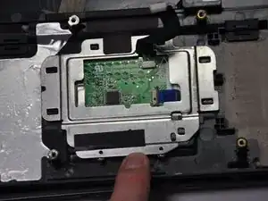 Найдите зелёный чип, заключённый в алюминиевую рамку, на нижней стороне пластиковой панели, которая была снята последней согласно руководству по разборке ноутбука.