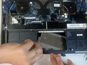 Слегка откройте ноутбук и надавите на модуль вниз кончиками пальцев, аккуратно. Он должен отщёлкнуться по бокам и упасть в образовавшееся пространство при слегка открытом ноутбуке.