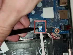 Отклейте ленту, которая фиксирует разъём кабеля батареи на системной плате.