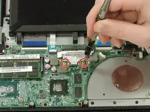 Удалите два винта, крепящие сетевой адаптер к материнской плате.
