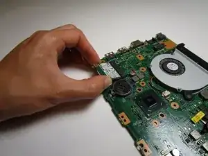 Отсоедините аккумулятор от ноутбука, подняв разъём плоским концом инструмента.