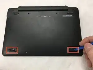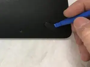 Переверните клавиатуру и пластиковой вскрывающей инструментом снимите две резиновые накладки с клеевым слоем, расположенные дальше всего от шарнира.