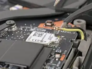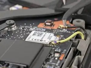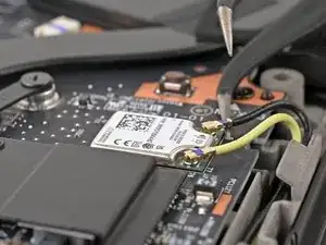 Вставьте одну лапку изогнутых пинцетов под металлическую шейку одного из коаксиальных разъёмов на карте Wi‑Fi и поднимите строго вверх, чтобы отсоединить его.