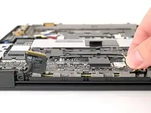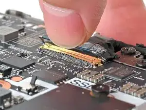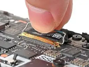 Используйте чистый ноготь или плоский конец медиатора, чтобы аккуратно поддеть и приподнять металлическую защёлку разъёма дисплейного кабеля и отщёлкнуть её.