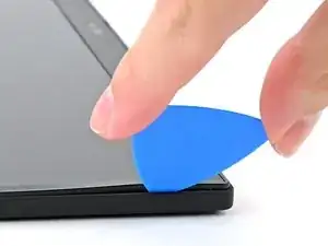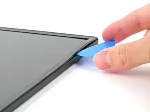 Вставьте кончик пластиковой лопатки под углом вниз между рамкой и сборкой экрана, рядом с верхним правым углом.