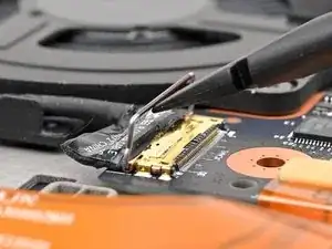 Удерживая защёлку и кабель вместе, потяните их вверх, чтобы отделить клей, фиксирующий кабель к материнской плате.