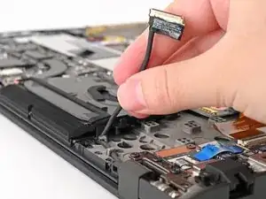 Возьмите оба кабеля антенн Wi‑Fi и выведите их из клипс на рамке до тех пор, пока они не останутся прикреплёнными к ноутбуку только в области шарнира.