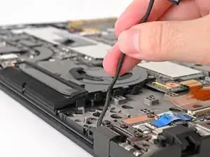 Вставьте лопатку слева от веб‑камеры и проведите её к верхнему левому углу, затем вниз по левому краю, чтобы отщёлкнуть оставшиеся защёлки.