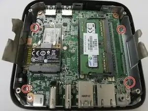Отверткой Phillips #1 снимите четыре винта Phillips M2.5×4.0, которые крепят системную плату к компьютеру.