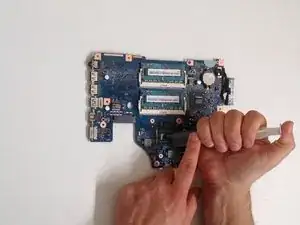 Осторожно приподнимите материнскую плату и отключите кабель аккумулятора.