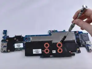 Выкрутите одиннадцать винтов Phillips #1 длиной 4,6 мм вокруг материнской платы.