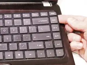 Освободите верхнюю часть клавиатуры, приподняв её и аккуратно подтянув вверх до тех пор, пока клавиатура полностью не приподнимется.