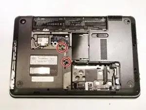Снимите два винта Phillips #1 длиной 6,5 мм с задней части компьютера.