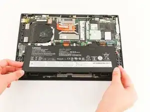 Извлеките аккумулятор, подняв его с верхнего края ноутбука, а затем оттянув от материнской платы.