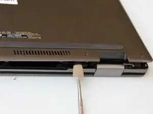 Вставьте металлическую лопатку в щель между задней панелью и задней частью экрана.