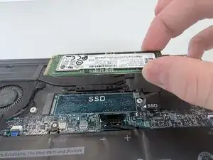 Возьмите SSD с обеих сторон и вытяните его из слота.
