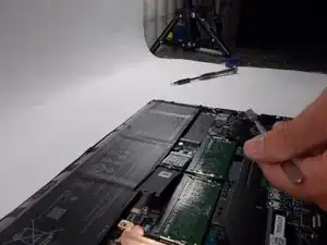Удалите один винт с левой стороны SSD с помощью отвертки Phillips #00.
