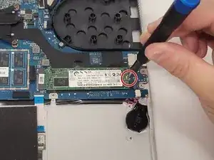 Используя крестовую отвертку #00, удалите один винт длиной 5 мм, который удерживает SSD на материнской плате.