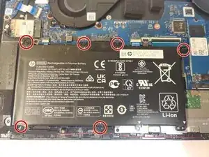 Удалите шесть винтов Phillips M2.0 × 4.0, удерживающих батарею на месте.