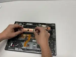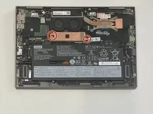 Используйте отвертку Philips #1, чтобы удалить два винта длиной 2.2 мм, крепящих медную пластину над SSD.