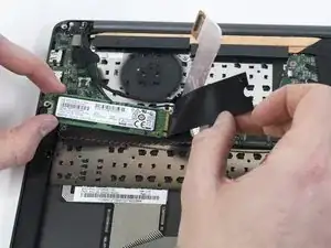 Поднимите черную пластиковую крышку и соединительный кабель, чтобы получить доступ к SSD.