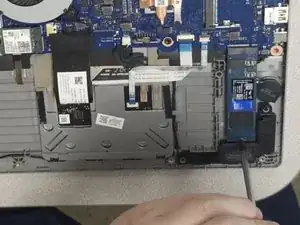 Используйте маленькую крестовую отвёртку, чтобы выкрутить винт, удерживающий нижнюю часть SSD.