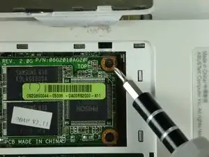 Удалите два винта Phillips #0 длиной 4,76 мм, крепящие SSD.