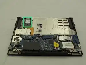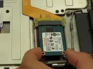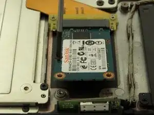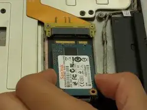 Найдите SSD, расположенный в углу на стороне, противоположной месту соединения экрана ноутбука и корпуса устройства.