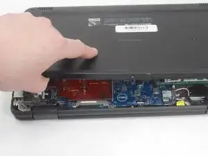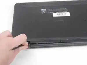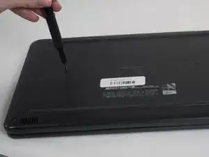 Вставьте нейлоновую лопатку между нижней крышкой и шасси в двух местах шарниров на задней стороне ноутбука и подденьте нижнюю крышку.