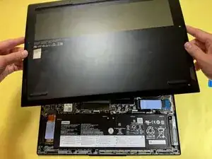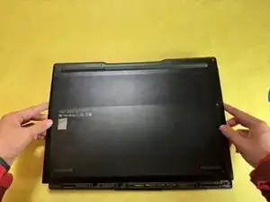 Возьмите нижнюю крышку и совместите её с корпусом ноутбука.
